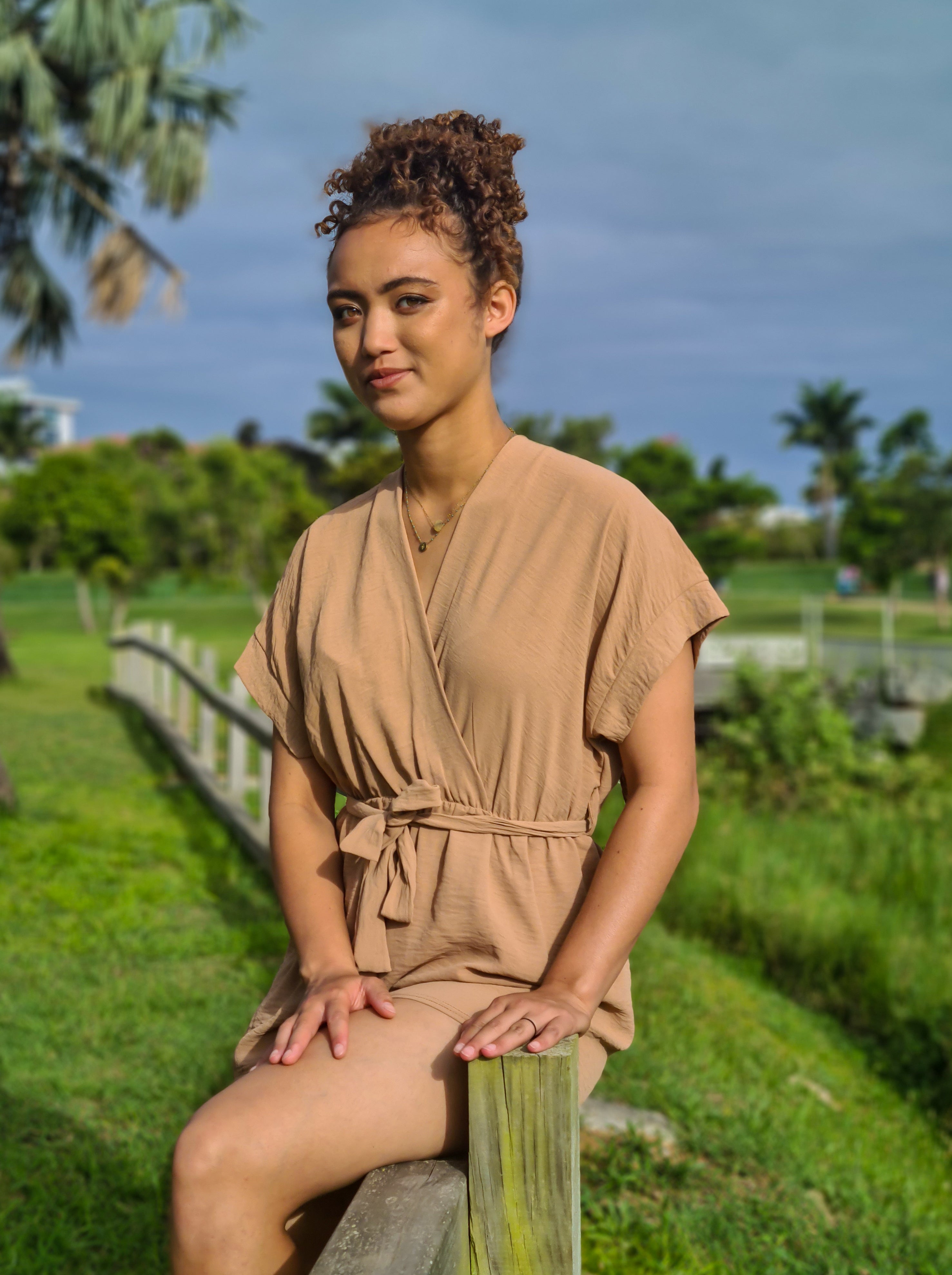 Combishort fluide à manches courtes, avec un col en V. Élastique à la taille et à nouer dans le dos.