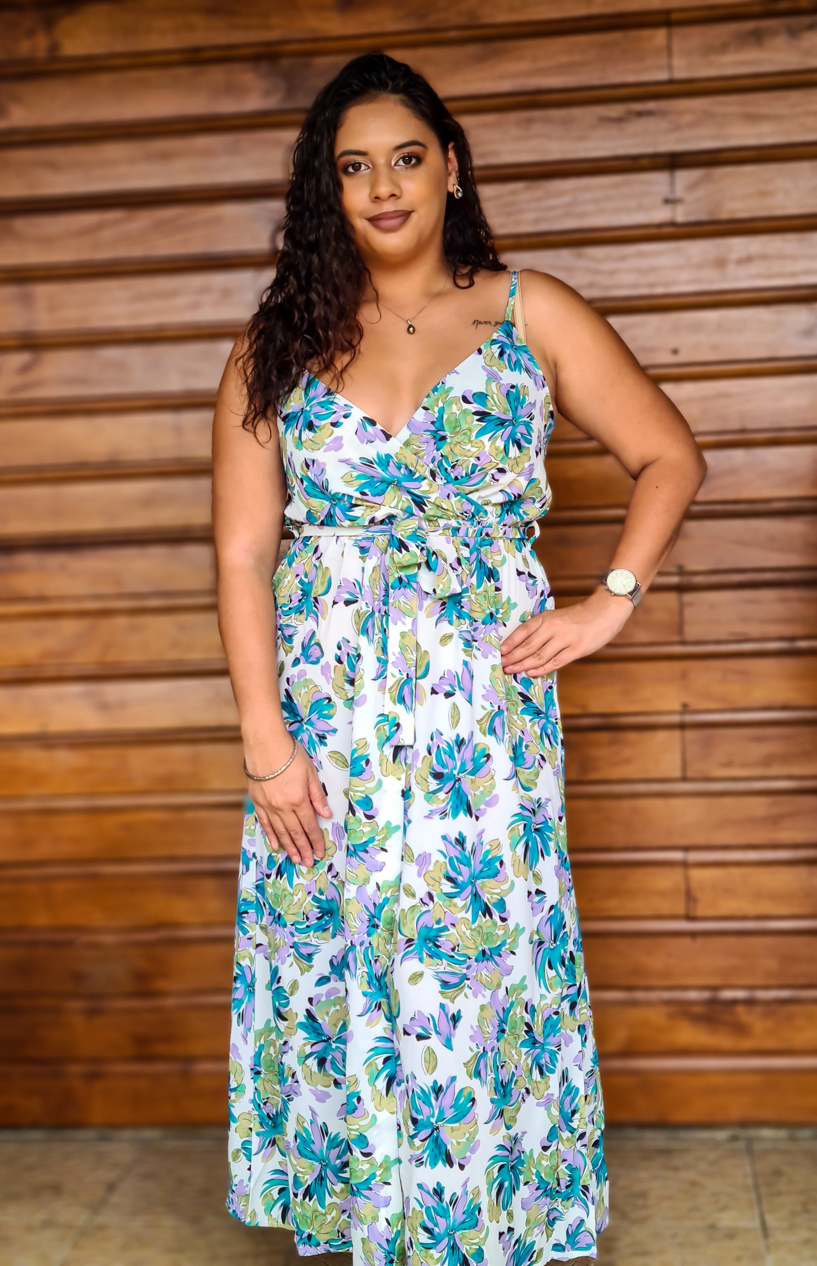 Robe longue cache-coeur avec des imprimés floraux.