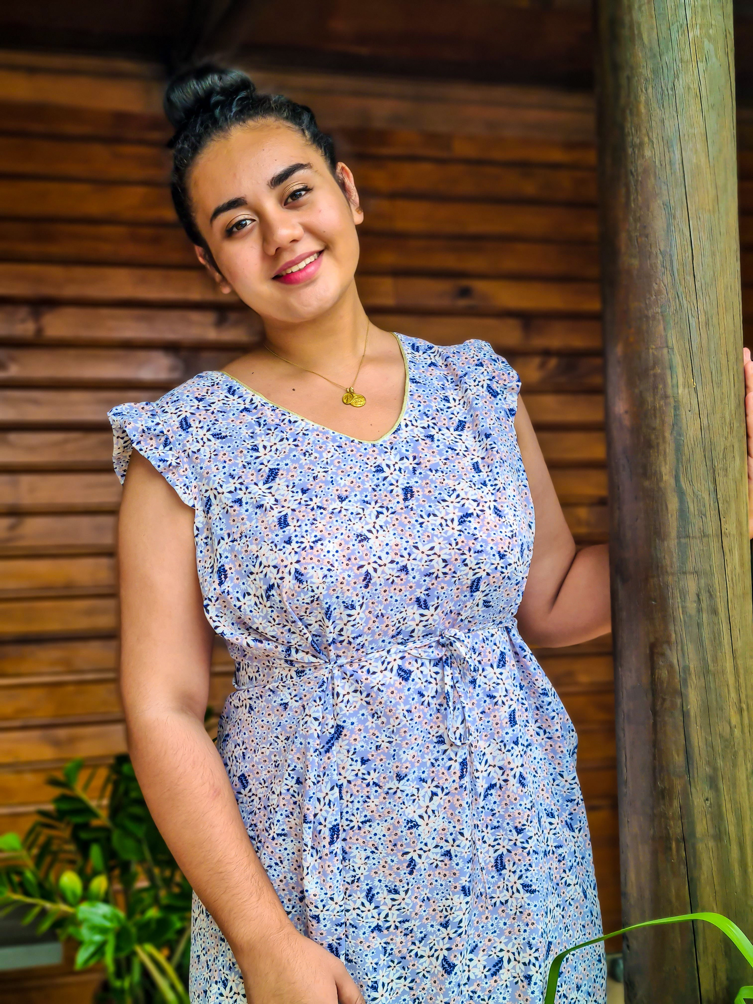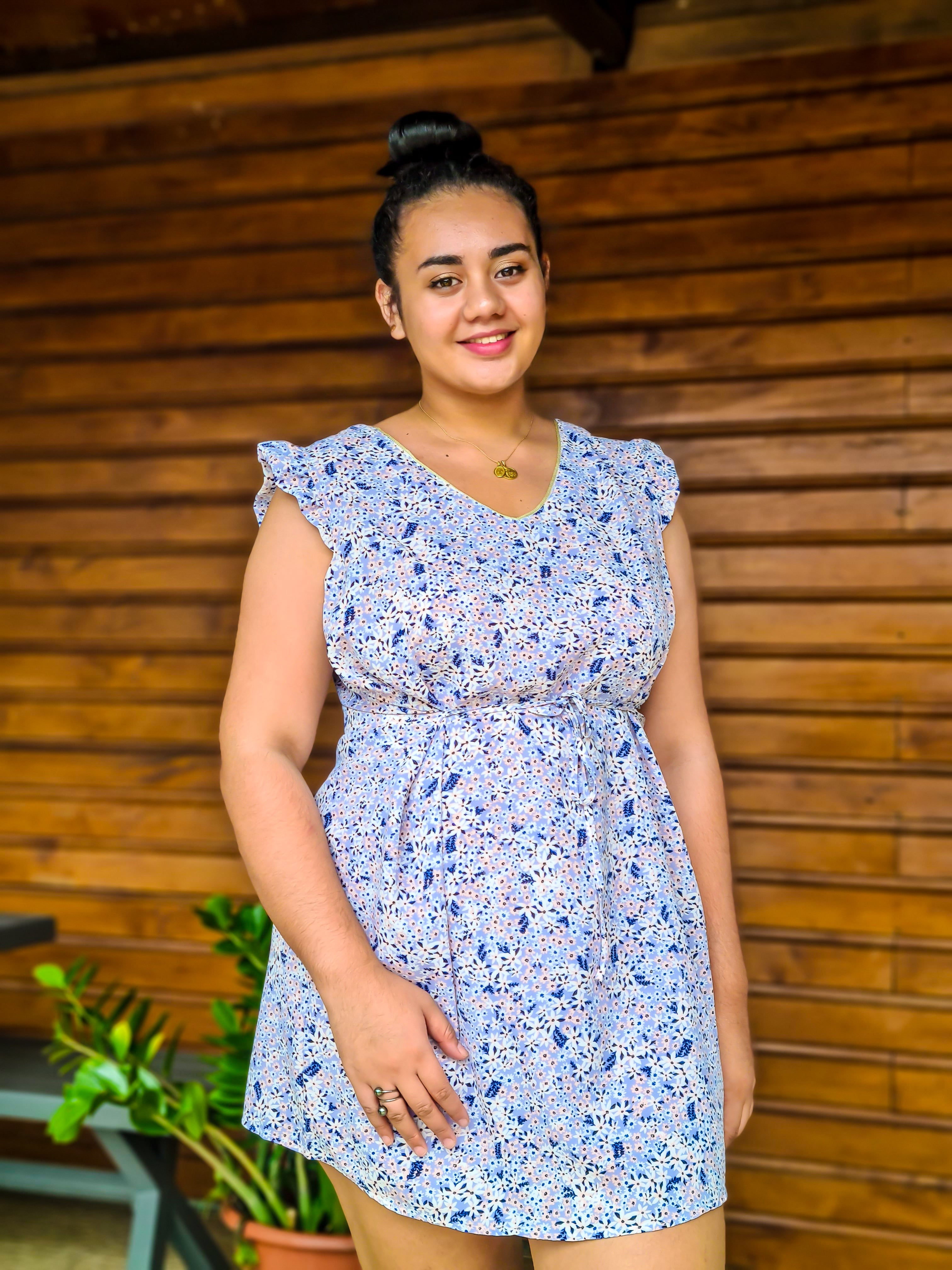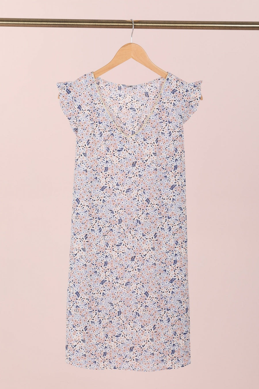 Robe oversized sans manches, avec des imprimés fleuris. Se porte ample ou à nouer à la taille avec une ceinture.