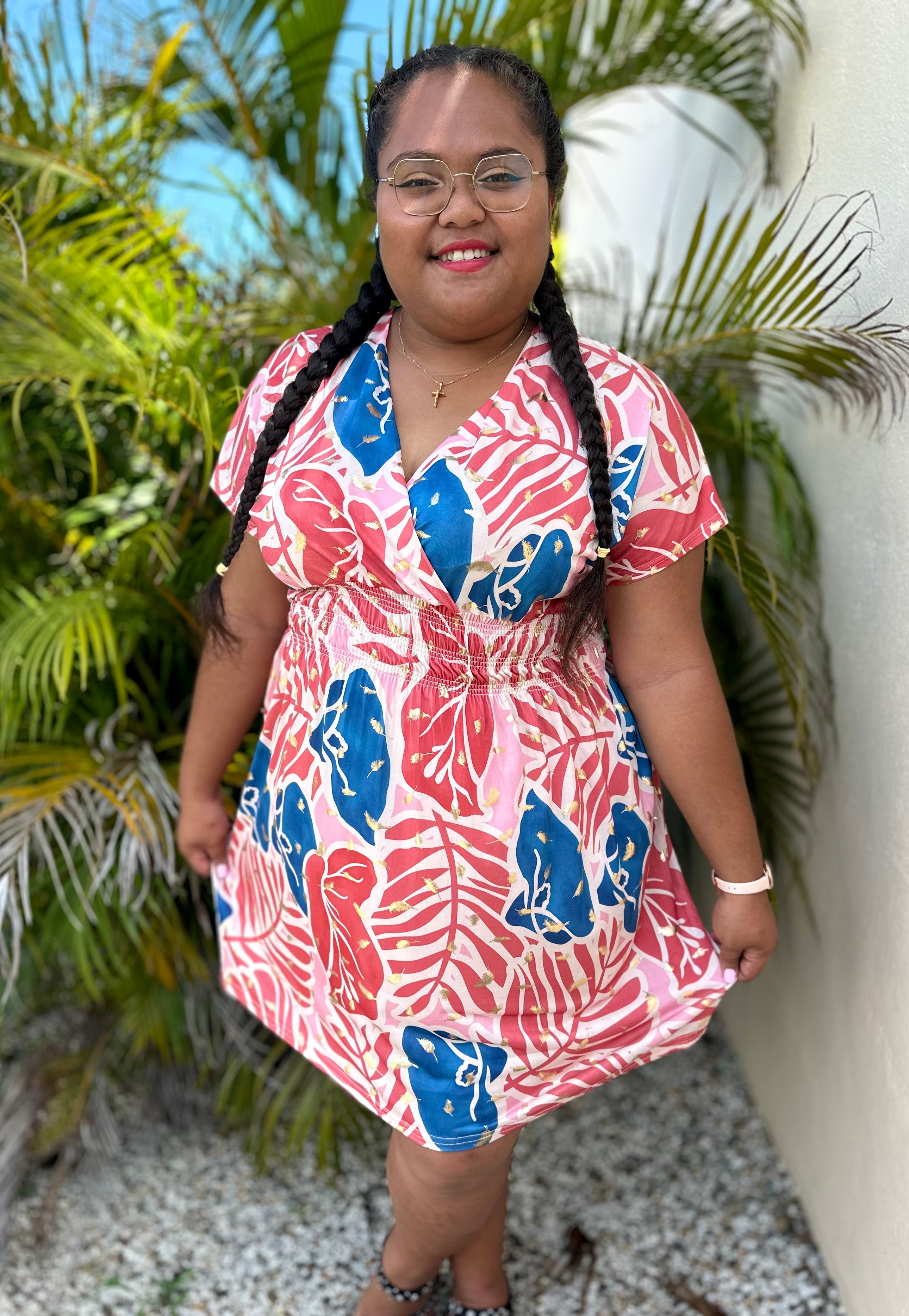 Robe fluide, à manches courtes, avec un col en V. Élastique à la taille.