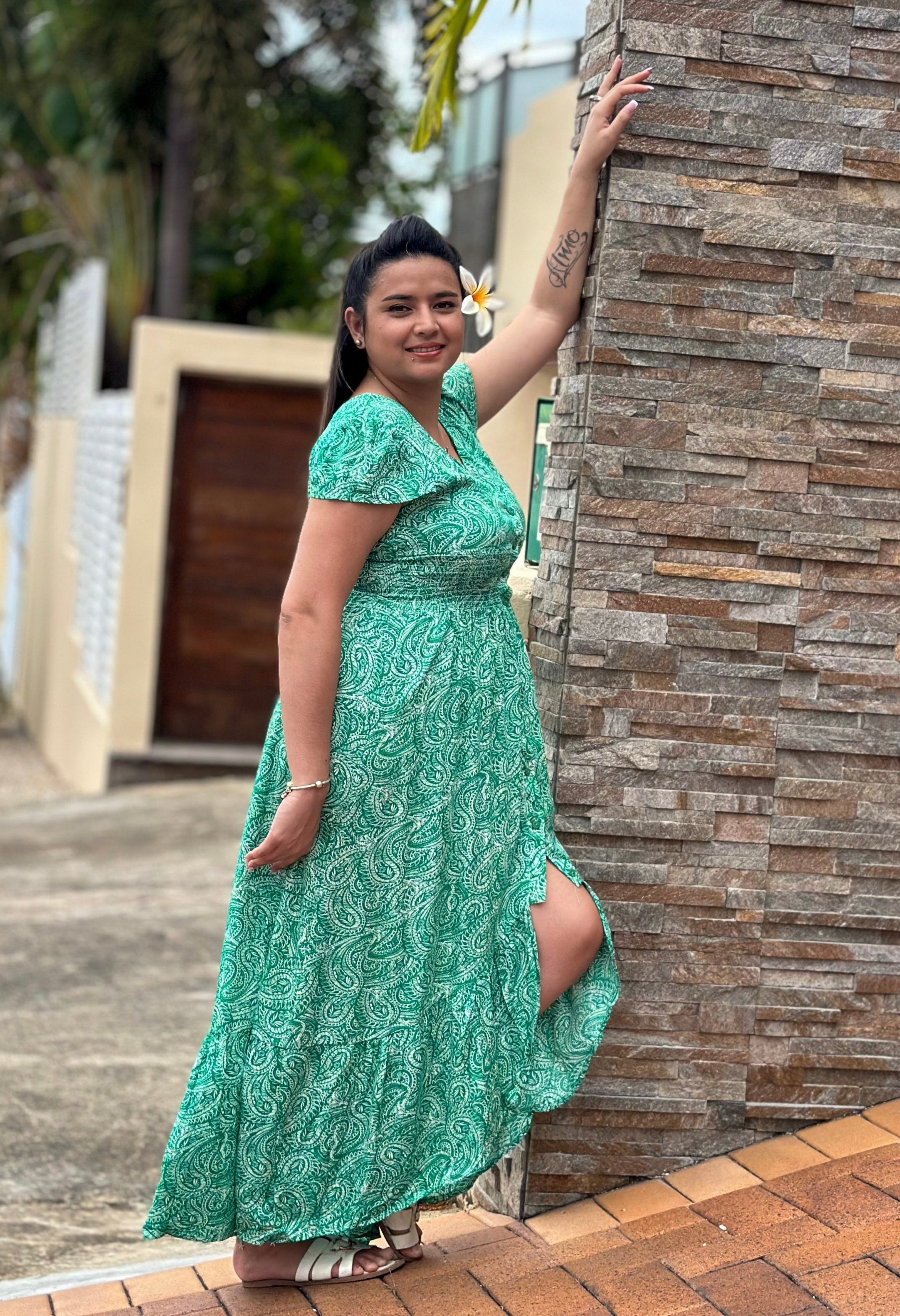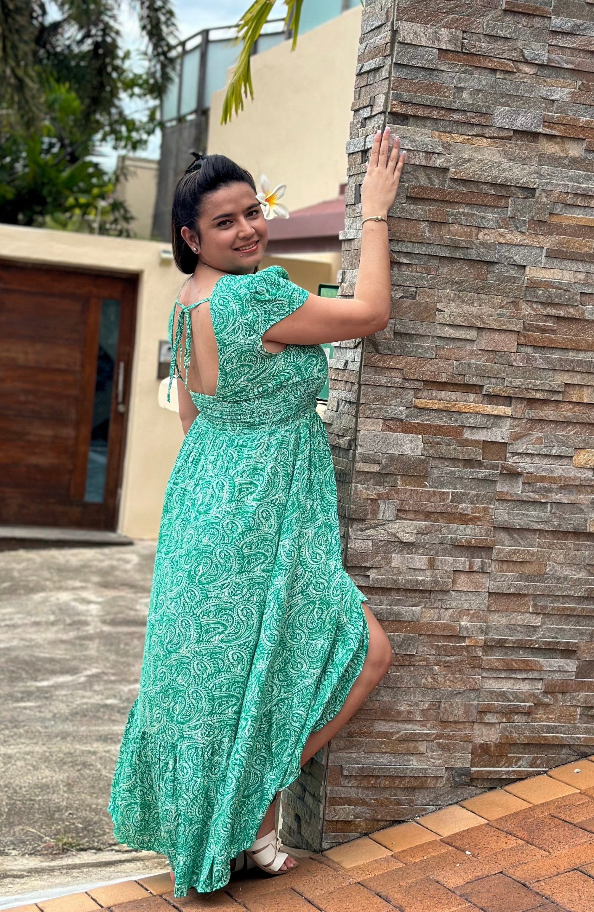 Robe longue dos nu, à manches courtes, avec un col en V. À nouer dans le dos.