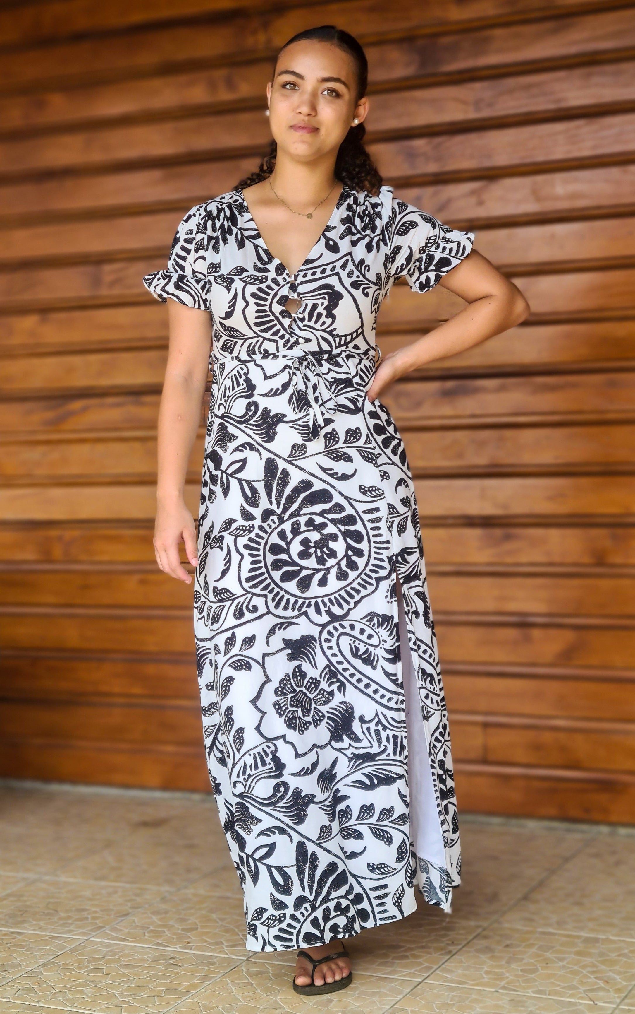 Robe longue à manches courtes, avec une fente (sur le côté gauche) et un col en V.