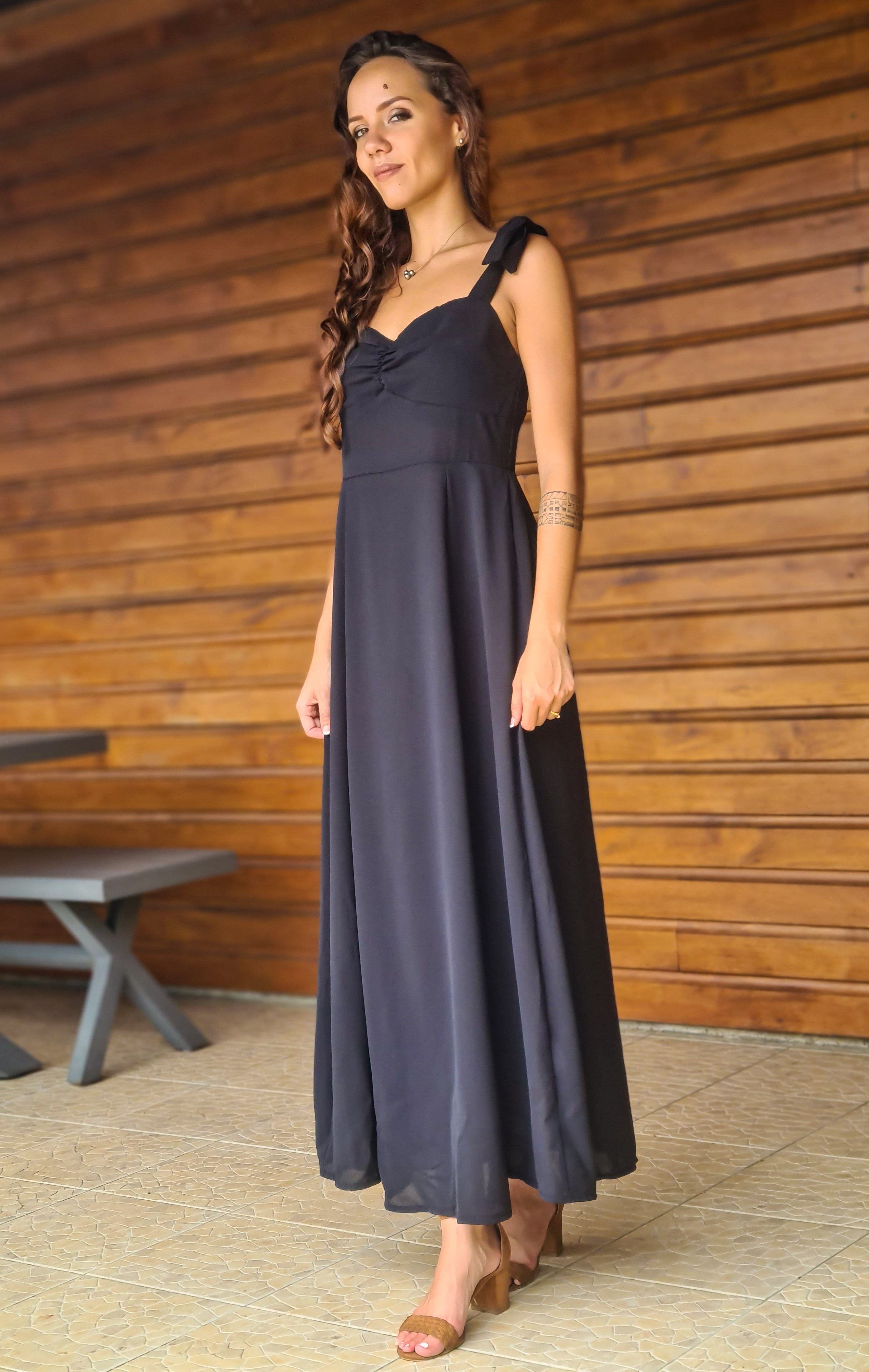 Robe longue unie, avec des bretelles (à nouer) et une fente (sur le côté gauche).