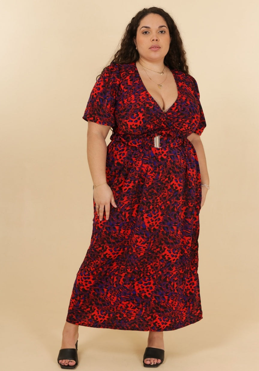 Robe longue à manches courtes, avec un col en V et une fente sur chaque côté de la robe.